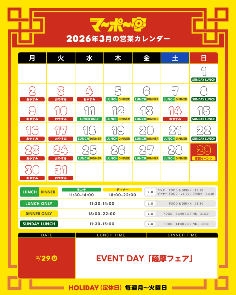 お知らせ マーポー亭3月の営業カレンダー マーポー亭3月の営業カレンダーです。月・火が定休日です。今月から水曜日の営業日を作りました!3/11(水)はランチ営業のみです3/14(土)はお休みです3/15(日)は時短営業で14:00クローズです3/29(日)は店舗イベントで「薩摩フェ... 2026.03.05 お知らせ