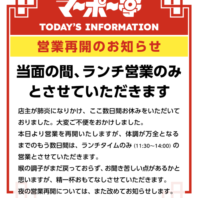 お知らせ メニューと価格の見直しについて 日頃からマーポー亭をご利用いただき、ありがとうございます!3月から、メニューと価格を新しくリフレッシュすることにしましたのでお知らせです。調味料や食材、光熱費などあらゆる価格が高騰する中、値上げせずに1年5ヶ月頑張ってきましたが、当店の象徴... 2026.02.20 お知らせ