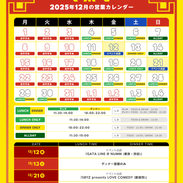 お知らせ マーポー亭12月の営業カレンダー マーポー亭12月と年始の営業カレンダーです。12/12(金)、12/21(日)がイベント出店のため店舗お休みです。12/13(土)はディナー営業のみです。ご来店の際は、お気をつけくださいませ。営業時間の変更や臨時休業など発生しましたら、スト... 2025.12.03 お知らせ