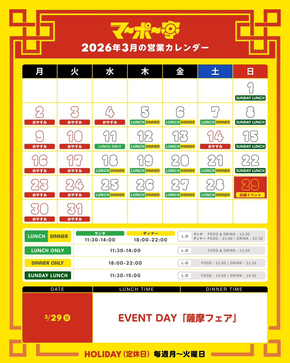マーポー亭3月の営業カレンダーです。月・火が定休日です。