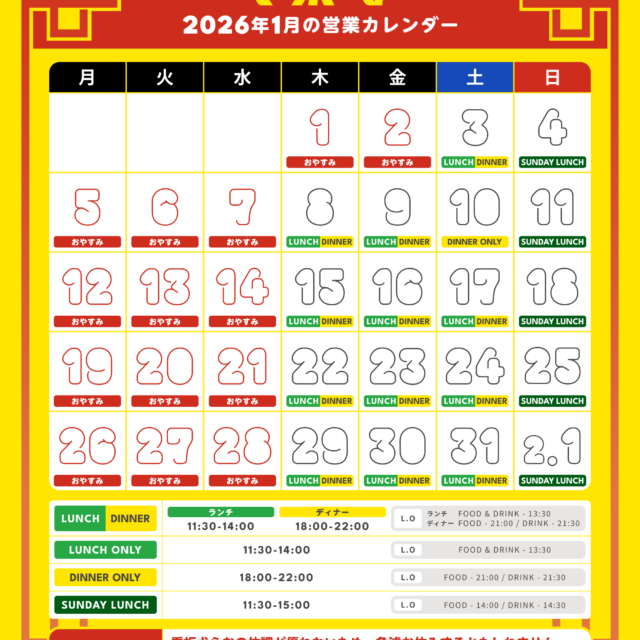 お知らせ マーポー亭2026年1月の営業カレンダー